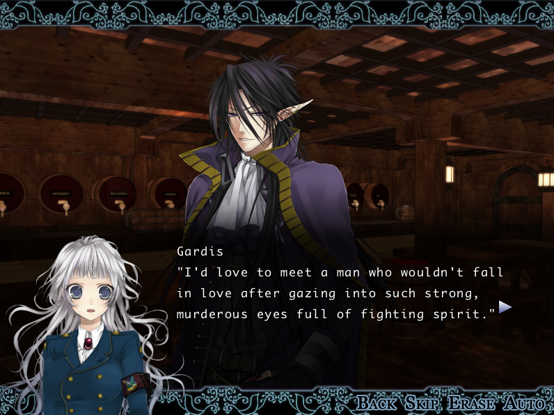 Ce que je vous dis concerne plus le triangle amoureux Gardis x Chris x Lezette, qui est le centre des deux routes principales, Jin n’ayant très clairement aucun intérêt pour l’histoire. Alors pourquoi sa route existe ? Tout simplement pour le fanservice. Et le jeu sait y faire. Alors non, contrairement à son prédécesseur Queen of Darkness, The Second Reproduction n’est pas un R18 et ne présente de ce fait pas de scènes de sexes explicites avec tout le tralala. Mais faut quand même se le dire: y a du cul, on le sait. Les personnages en parlent et pratiquent. On nous manque pas de nous préciser que Chris est vierge et que son rang la pousse à le rester jusqu’au mariage bien qu’elle-même semble être plus « libérée », allant jusqu’à dire que c’est pas comme si elle allait en mourir. Malgré certaines scènes frôlant l’abus (bonjour Jin), ce sera quand même une des rares fois que vous verrez une héroïne ne pas rougir au moindre sous-entendu sexuel tout en les comprenant.