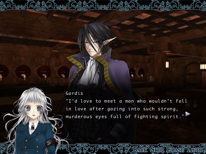 J’affectionne toujours autant Chris d’un amour sans nom et c’est le parfait exemple à renvoyer à la gueule des gens qui pensent que seules les « nouvelles » héroïnes d’Otome en valent la peine, y a toujours eu des héroïnes badass. A vrai dire l’affection que je porte à ce jeu du à la nostalgie me pousse à vouloir un jeu avec la même histoire, le même concept, les mêmes personnages (sauf Jin) mais en mieux écrit et approfondis et avec des doublages dignes de ce nom. Sans déconner Lezette n’est absolument pas crédible, Gardis a l’air de jouer un personnage jouant lui-même un autre personnage. Chris elle est passable. Il faut aussi comprendre que le doublage est partiel pour et que seuls les personnages principaux sont doublés, ce qui s’explique par le fait que c’est un doujin (jeu indé).