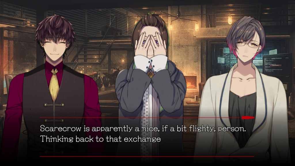 Autre coup de cœur niveau personnage: le petit Crow-chan uwu !! Petit.. pas tant que ça, il a quand même un an de plus que l’héroïne et mesure 1m178 …. bref. Crow est le « boss de l’ombre » autoproclamé, c’est un hacker de génie très compétant même s’il semble assez immature socialement. Il ne sort pas très souvent de chez lui et communique surtout avec les autre personnage depuis leurs portables. Il aime bien se mettre en scène comme quelqu’un de très important, ce qui n’est pas tout à fait faut: les personnages vivent dans *sa* maison. Il a une attitude assez comique, et pourtant c’est le perso avec une des backstories les plus badantes.