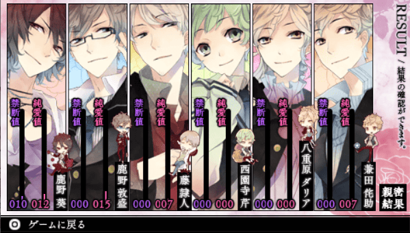 Il existe 2 stats pour chaque personnage : celle de l’interdit et celle de l’amour pur, ces stats vous dirigeront vers un type de route : Pure Love ou Prohibition, chaque route ayant une Hard et une Normale End. La notion de ce qu’est de « l’amour pur » ou non varie selon les personnages, ce qui peut donner des résultats assez surprenant en ce qui concerne le contenu de ces fins. En plus de ces fins, chaque route a 2 bad ends qui elles n’ont pas de CGs mais sont globalement assez pertinentes pour en valoir le coup selon les routes. Je conseille de faire au moins celles de Seri, Wabisuke et Aoi.