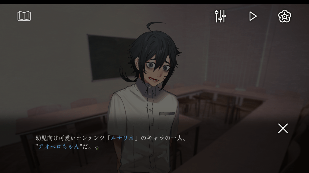 Le système est réduit au strict minimum, ce qui est aussi volontaire. En effet, contrairement à beaucoup de VNs classique, Club Suicide ne vous propose pas de réécouter les lignes de dialogues déjà passées via le backlog, il n’y a pas non plus de galerie vous permettant de voir les CGs débloquées. Tout ça n’est pas un oubli, mais bien une volonté d’empêcher le joueur de revivre les événements passés. Il est aussi impossible de mettre le jeu en format fenêtre : on est prisonniers.